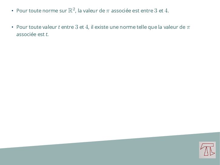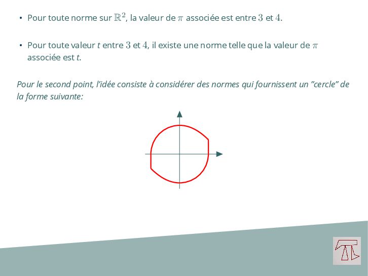 associée est entre 3 et 4. • Pour toute valeur t entre 3 et 4, il existe une norme telle que la valeur de π associée est t. Pour le second point, l’idée consiste à considérer des normes qui fournissent un ”cercle” de la forme suivante: