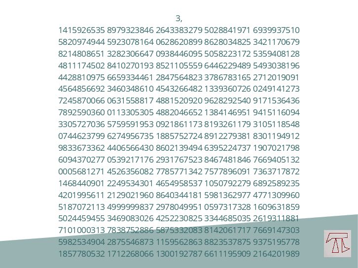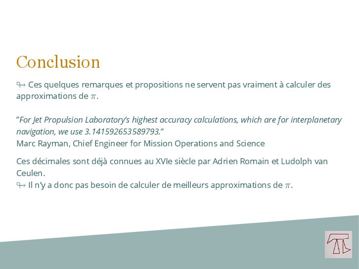 vraiment à calculer des approximations de π. ”For Jet Propulsion Laboratory’s highest accuracy calculations, which are for interplanetary navigation, we use 3.141592653589793.” Marc Rayman, Chief Engineer for Mission Operations and Science Ces décimales sont déjà connues au XVIe siècle par Adrien Romain et Ludolph van Ceulen. ↬ Il n’y a donc pas besoin de calculer de meilleurs approximations de π.