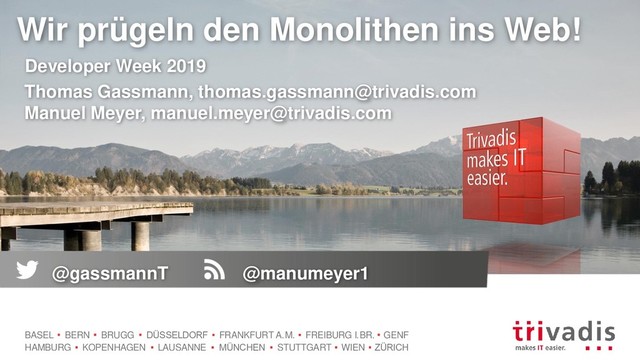 KOPENHAGEN LAUSANNE MÜNCHEN STUTTGART WIEN ZÜRICH Wir prügeln den Monolithen ins Web! Developer Week 2019 Thomas Gassmann, [email protected] Manuel Meyer, [email protected] @gassmannT @manumeyer1