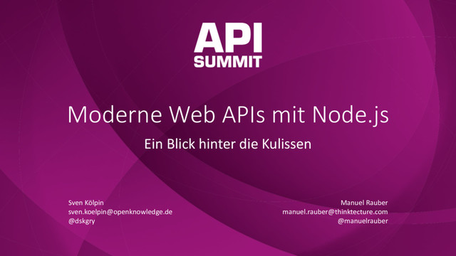 FullStack JavaScript: Vorbei sind die Zeiten, in denen JavaScript nur auf dem Client eingesetzt wurde! Große Firmen, wie Netflix, PayPal oder sogar die NASA machen es vor: JavaScript auf dem Server mit Node.js. Und dabei nutzen sie die Vorteile von Node.js: Asynchronität und Performance machen Echtzeitanforderungen zum Kinderspiel. Gepaart mit einem kleinen Server-Footprint und einer hohen Skalierbarkeit ist Node.js ideal für den Servereinsatz geeignet. Gemeinsam mit Ihnen werfen Sven Koelpin und Manuel Rauber einen Blick auf die neue Welt und zeigen, wie man mit Node.js moderne Web APIs entwickeln kann. Dabei werden Themen wie Absicherung von Web APIs, Datenbankanbindung und die Bereitstellung einer Single-Page Application anhand eines praktischen Beispiels erörtert – als Grundlage für Ihre „next generation“ Web API.