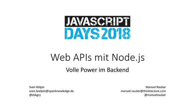 Die Zeiten, in denen JavaScript nur auf dem Client eingesetzt wurde, ist vorbei! Netflix, PayPal oder sogar die NASA machen es vor: JavaScript auf dem Server mit Node.js. Und dabei nutzen sie die Vorteile von Node.js: Asynchronität und Performance machen Echtzeitanforderungen zum Kinderspiel – bei einem kleinen Server-Footprint und hoher Skalierbarkeit. Das macht Node.js zu einem echten Arbeitstier auf dem Server. Gemeinsam mit Ihnen werfen Sven Kölpin und Manuel Rauber einen Blick auf diese Welt und zeigen, wie man mit Node.js mit wenig Aufwand moderne Web APIs entwickeln kann. Als Grundlage für Ihre "Next Generation" Web API werden unter anderem Themen wie Absicherung von Web APIs, Datenbankanbindung und die Bereitstellung einer Single-Page Application erörtert.