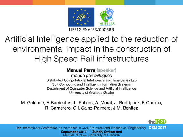 Engineering - CSM 2017 September, 2017 — Zurich, Switzerland Artificial Intelligence applied to the reduction of environmental impact in the construction of High Speed Rail infrastructures Manuel Parra (speaker) [email protected] Distributed Computational Intelligence and Time Series Lab Soft Computing and Intelligent Information Systems Department of Computer Science and Artificial Intelligence University of Granada (Spain) ! M. Galende, F. Barrientos, L. Pablos, A. Moral, J. Rodríguez, F. Campo, R. Carnerero, G.I. Sainz-Palmero, J.M. Benítez Manuel Parra — University of Granada LIFE12 ENV/ES/000686