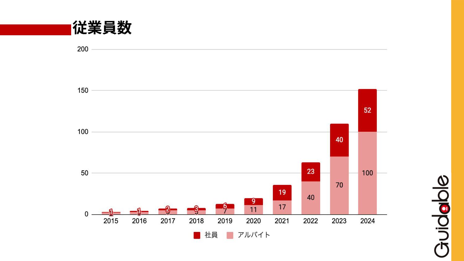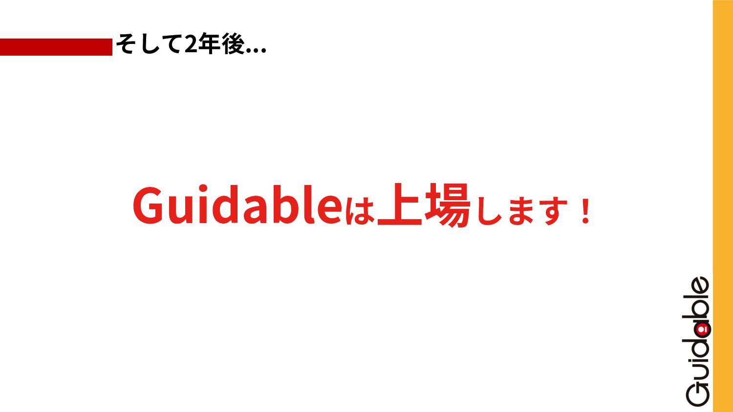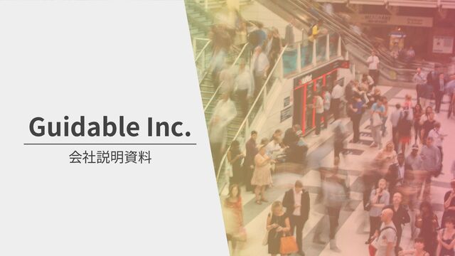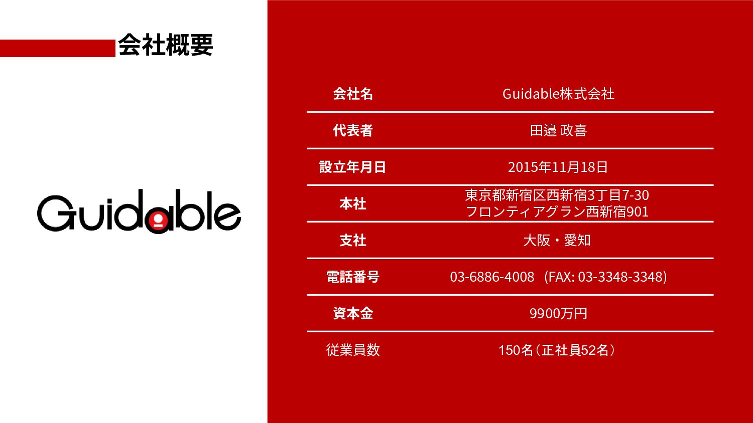 会社概要 会社名 Guidable株式会社 代表者 ⽥邉 政喜 設⽴年⽉⽇ 2015年11⽉18⽇ 本社 東京都新宿区⻄新宿3丁⽬7-30