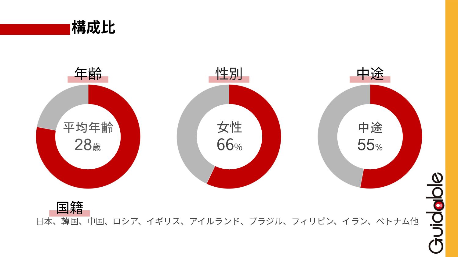 構成⽐ ⼥性 66% 年齢 性別 中途 国籍 ⽇本、韓国、中国、ロシア、イギリス、アイルランド、ブラジル、フィリピン、イラン、ベトナム他 中途