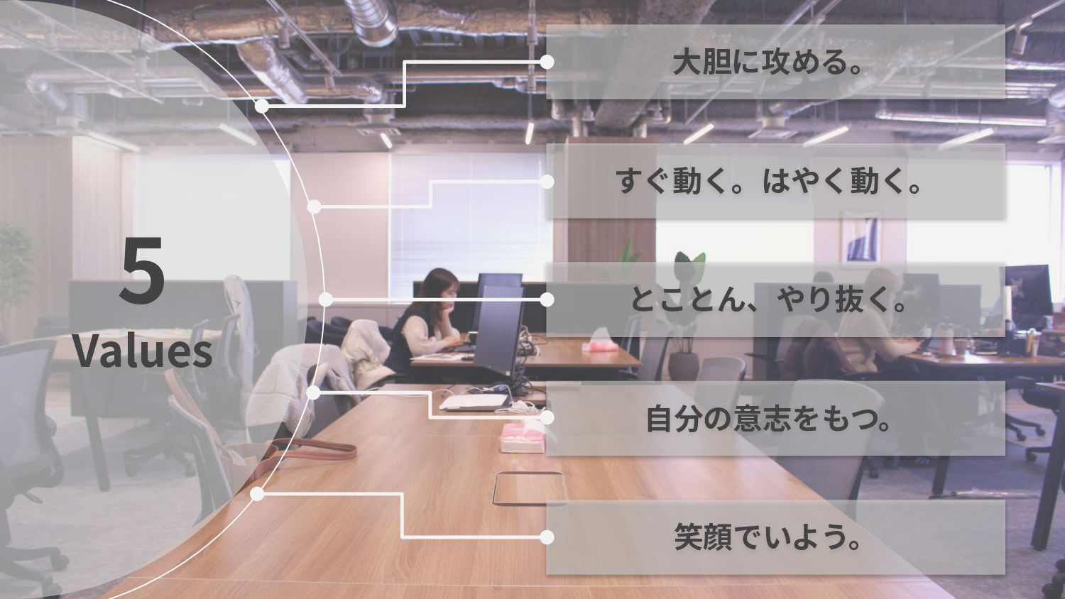 笑顔でいよう。 ⾃分の意志をもつ。 とことん、やり抜く。 すぐ動く。はやく動く。 ⼤胆に攻める。 5 Values