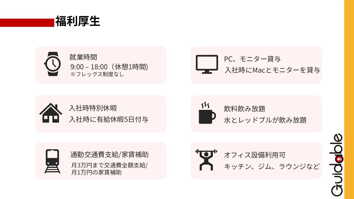 ⽉1万円の家賃補助 ⼊社時にMacとモニターを貸与 飲料飲み放題 ⽔とレッドブルが飲み放題 オフィス設備利⽤可 PC、モニター貸与 キッチン、ジム、ラウンジなど