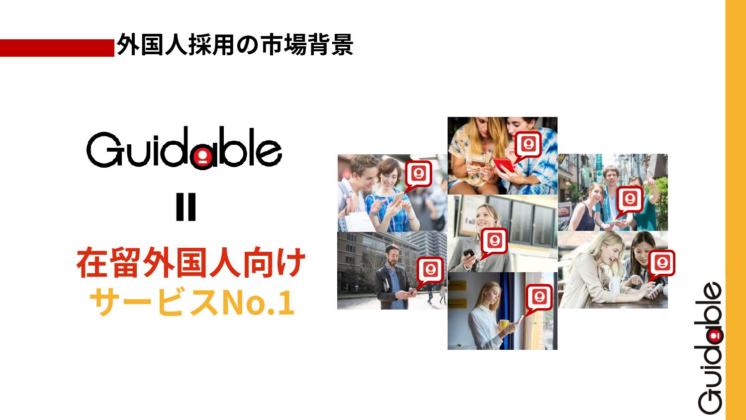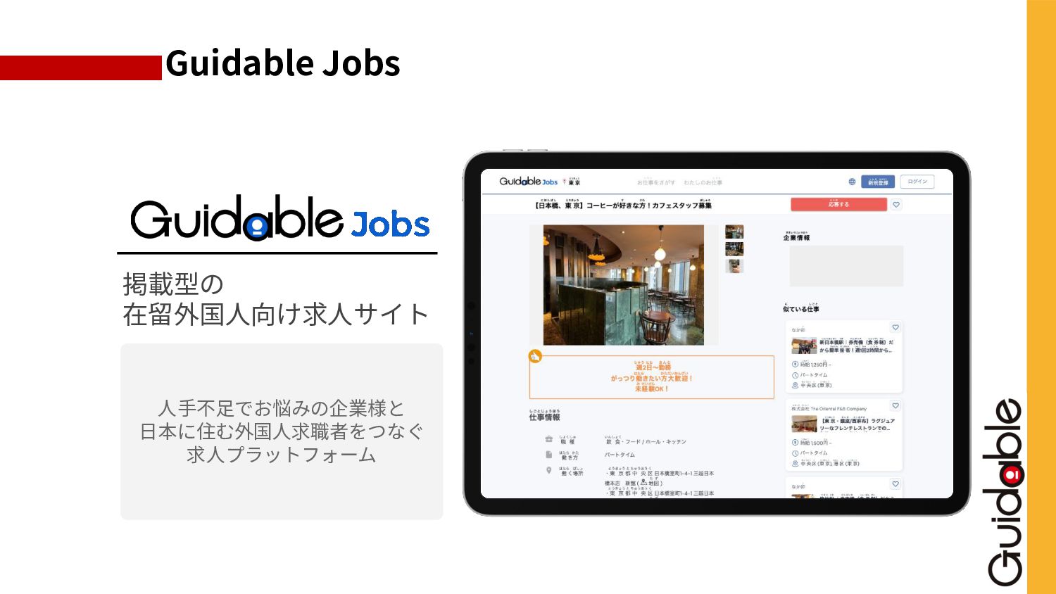 Guidable Jobs 掲載型の 在留外国⼈向け求⼈サイト ⼈⼿不⾜でお悩みの企業様と ⽇本に住む外国⼈求職者をつなぐ 求⼈プラットフォーム