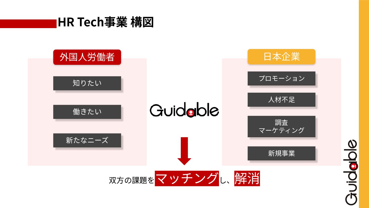 HR Tech事業 構図 双⽅の課題をマッチングし、解消 知りたい 外国⼈労働者 ⽇本企業 働きたい 新たなニーズ プロモーション
