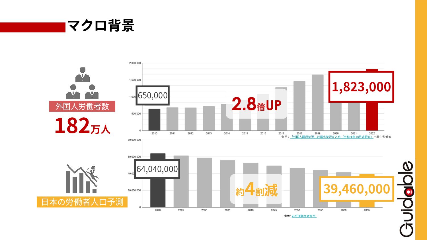 マクロ背景 1,823,000 650,000 外国⼈労働者数 182万⼈ ⽇本の労働者⼈⼝予測 39,460,000 64,040,000 参照:「外国⼈雇⽤状況」の届出状況まとめ(令和4年10⽉末現在)ー厚⽣労働省 参照:みずほ総合研究所