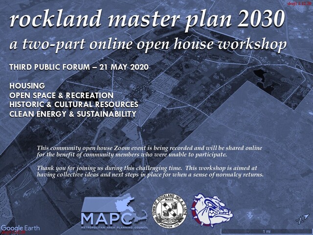 planning topics Master planning a road map to inform future collective decision making WHO? Town of Rockland RMP Advisory Committee MAPC consultants Community participants A TWO-PART ONLINE OPEN HOUSE Part 1: A real-time Zoom event Part 2: Online open house “room” through June 2020 at mapc.ma/rmp_3rd