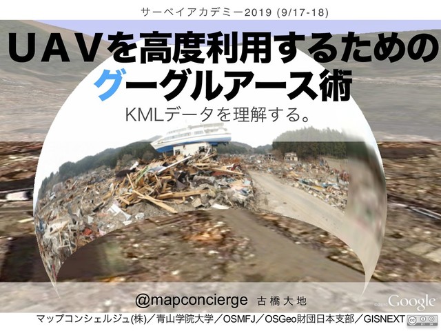 U H A S H I Taichi @mapconcierge GIS Expert of JICA (Alos4Amazon Project) President of MAPconcierge inc, Prof. of Aoyama Gakuin Univ. Vise-President of OpenStreetMap foundation japan Director of OSGeo.JP foundation Tech. Writer of GISNEXT Magazine Evangelist of KML Tree Climber