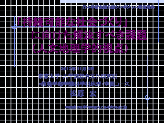 「持続可能な社会づくり」に向けた解決すべき課題(人文地理学的視点):松原 宏(日本学術会議会員、東京大学大学院総合文化研究科教授) --- 持続可能な社会づくりに向けた地理教育の充実 -SDGs実現における教育の役割- 日本学術会議公開シンポジウム(2017Nov04)開催報告