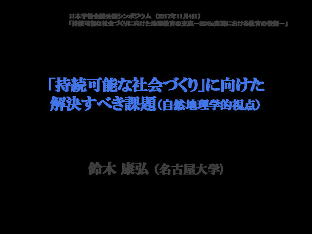 「持続可能な社会づくり」に向けた解決すべき課題(自然地理学的視点):鈴木康弘(日本学術会議連携会員、名古屋大学減災連携研究センター教授) --- 持続可能な社会づくりに向けた地理教育の充実 -SDGs実現における教育の役割- 日本学術会議公開シンポジウム(2017Nov04)開催報告