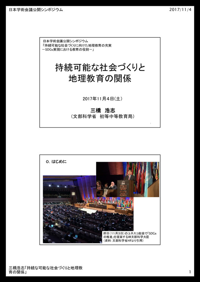 持続可能な社会づくりと地理教育の関係:三橋浩志(文部科学省教科書調査官) --- 持続可能な社会づくりに向けた地理教育の充実 -SDGs実現における教育の役割- 日本学術会議公開シンポジウム(2017Nov04)開催報告