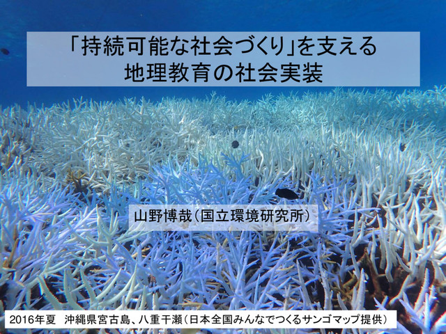 地球温暖化(水温上昇)によるサンゴ分布変化 Coral habitat change due to SST warming 海洋酸性化によるサンゴ分布変化 Coral habitat change due to ocean acidification CO2 低排出(SRES B1) シナリオによる予測 高水温は無く、海洋酸性化の影響は九州〜四国まで No bleaching, and the effect of ocean acidification would be limited to higher latitudes 気候変動の緩和の必要性と根拠を提示、その上で適応策として保全すべき海域を特定 Yara et al. (2016)