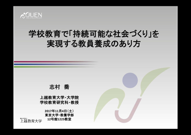 学校教育で「持続可能な社会づくり」を実現する教員養成のあり方:志村 喬(上越教育大学大学院学校教育研究科教授) --- 持続可能な社会づくりに向けた地理教育の充実 -SDGs実現における教育の役割- 日本学術会議公開シンポジウム(2017Nov04)開催報告