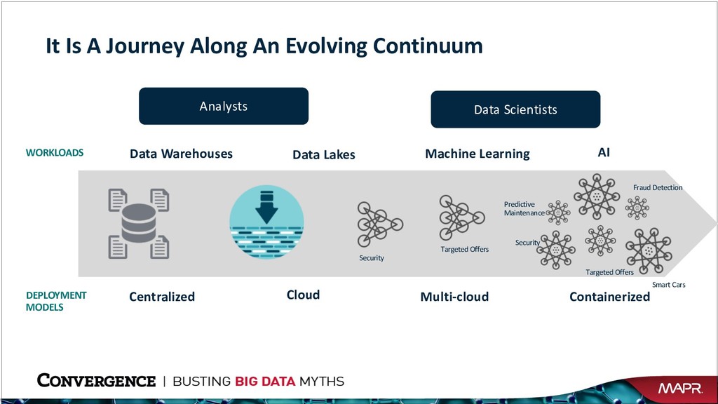 Is A Journey Along An Evolving Continuum Data Warehouses Data Lakes Machine Learning Analysts Data Scientists Centralized Cloud Multi-cloud WORKLOADS DEPLOYMENT MODELS AI Targeted Offers Fraud Detection Smart Cars Containerized Targeted Offers Security Predictive Maintenance Security