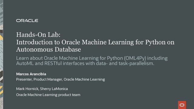 You will learn to provision your Autonomous Database and create OML users, load sample data from Github, manipulate database tables as Pandas DataFrame proxy objects, build powerful machine learning models, and use AutoML through the Python API and no-code OML AutoML UI.