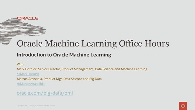 In this first Office Hours session for Oracle Machine Learning, Mark Hornick provides an introduction to the Oracle Machine Learning (OML) family of products, both on-premises and on the Oracle Cloud. Learn about the key component technologies and features available today, and that are coming soon. See how the key attributes of automation, scalability, and production readiness enable enterprises to increase productivity, achieve enterprise goals faster, and innovate more.