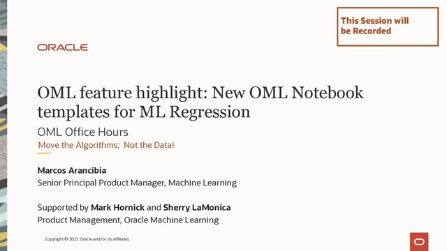 On this weekly Office Hours for Oracle Machine Learning on Autonomous Database, we introduced the latest Notebook templates for Machine Learning Regression problems. This was a follow-along Session, since the OML Notebook templates are available to any Autonomous Database tenancy, and you were able to run it while we demonstrated it.