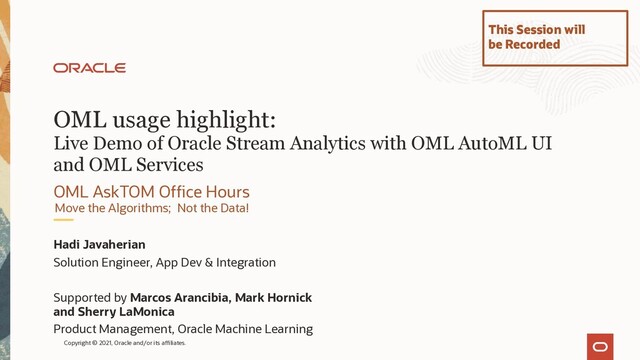 On this weekly Office Hours for Oracle Machine Learning on Autonomous Database, Hadi Javaherian, Senior AppDev and Integration Platform Specialist explained all the benefits of the integration between Oracle Stream Analytics and Oracle Machine Learning Services. He shared how this is directly related to the concept of Data Mesh at a high level, and also showed how easy it is for a user to create models using OML AutoML UI and deploy them in seconds to OML Services, which then are made available immediately to Oracle Stream Analytics for real time scoring.
