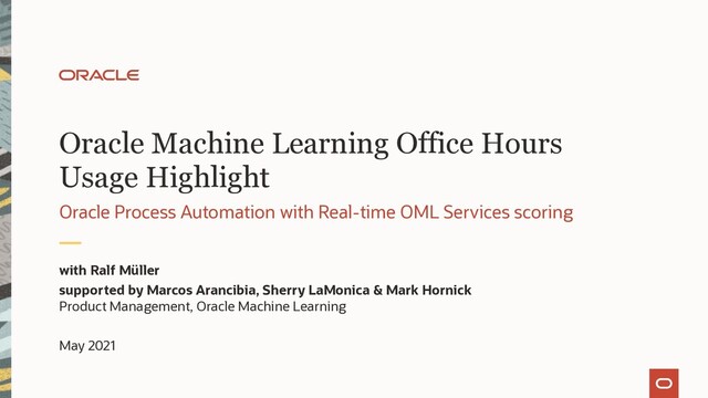 This week in our Office Hours for Oracle Machine Learning on Autonomous Database Ralf Mueller, Architect for Oracle Intelligent Automation provided the architecture and demo of integrating Process Automation with direct calls for scoring OML models using the OML Services REST APIs in real-time.
