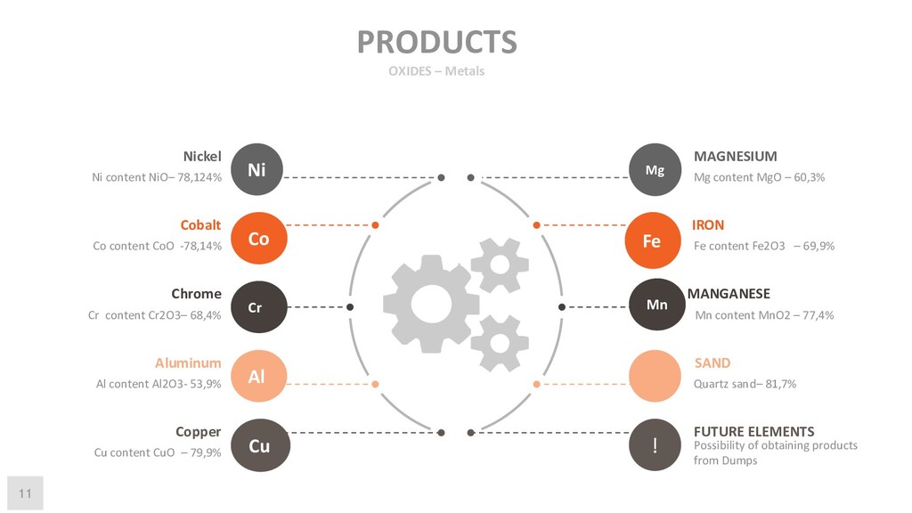 EFFICIENCY Complex metal extraction - Mg, Al, Cr, Cu, Fe, Mn, Ni, Co, plus quartz sand. Concentrates with high metal oxide content POSSIBILITY - extraction of metals from ore on board 0.3. SIMPLE SCHEME Return cycle of water supply with little makeup. Reverse cycle of neutralization and sulfuric acid production. PRODUCTION OF SULFURIC ACID Production of sulfuric acid. Provision of MgO reagent production. Provision of electricity and heat production. ECOLOGY Minimal adverse impact on the region 's ecology. Waste-free production.