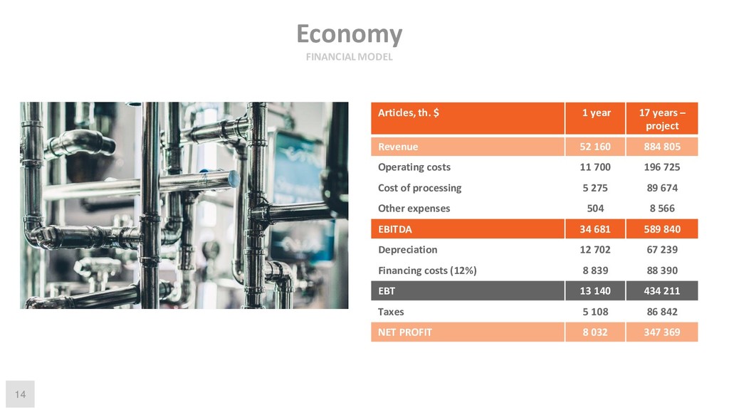 investment - $3 375 000 Establishment of a joint LLP with a potential investor Assembly of the work organization team. It is necessary Conclusion of a contract with a potential investor for partnership in the Project on contractual terms Agreement with the Investor Carry out industrial tests, approve Technical Regulations and start designing the Plant Tests + Design Ordering, payment and delivery of EQUIPMENT Equipment and ICW
