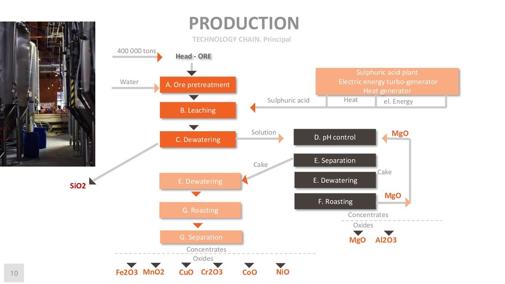 ORE Sulphuric acid plant Electric energy turbo-generator Heat generator В. Leaching С. Dewatering D. pH control E. Separation E. Dewatering F. Roasting E. Dewatering G. Roasting G. Separation SiO2 Water Sulphuric acid Heat el. Energy Solution Cake Cake MgO MgO Fe2O3 CuO Cr2O3 CoO NiO MgO Al2O3 MnO2 Concentrates Oxides Concentrates Oxides 400 000 tons