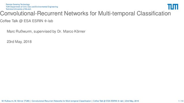 Engineering Technical University of Munich Convolutional-Recurrent Networks for Multi-temporal Classification Coffee Talk @ ESA ESRIN Φ-lab Marc Rußwurm, supervised by Dr. Marco K¨ orner 23rd May, 2018 M. Rußwurm, M. K¨ orner (TUM) | Convolutional-Recurrent Networks for Multi-temporal Classification | Coffee Talk @ ESA ESRIN Φ-lab | 23rd May, 2018 1 / 14
