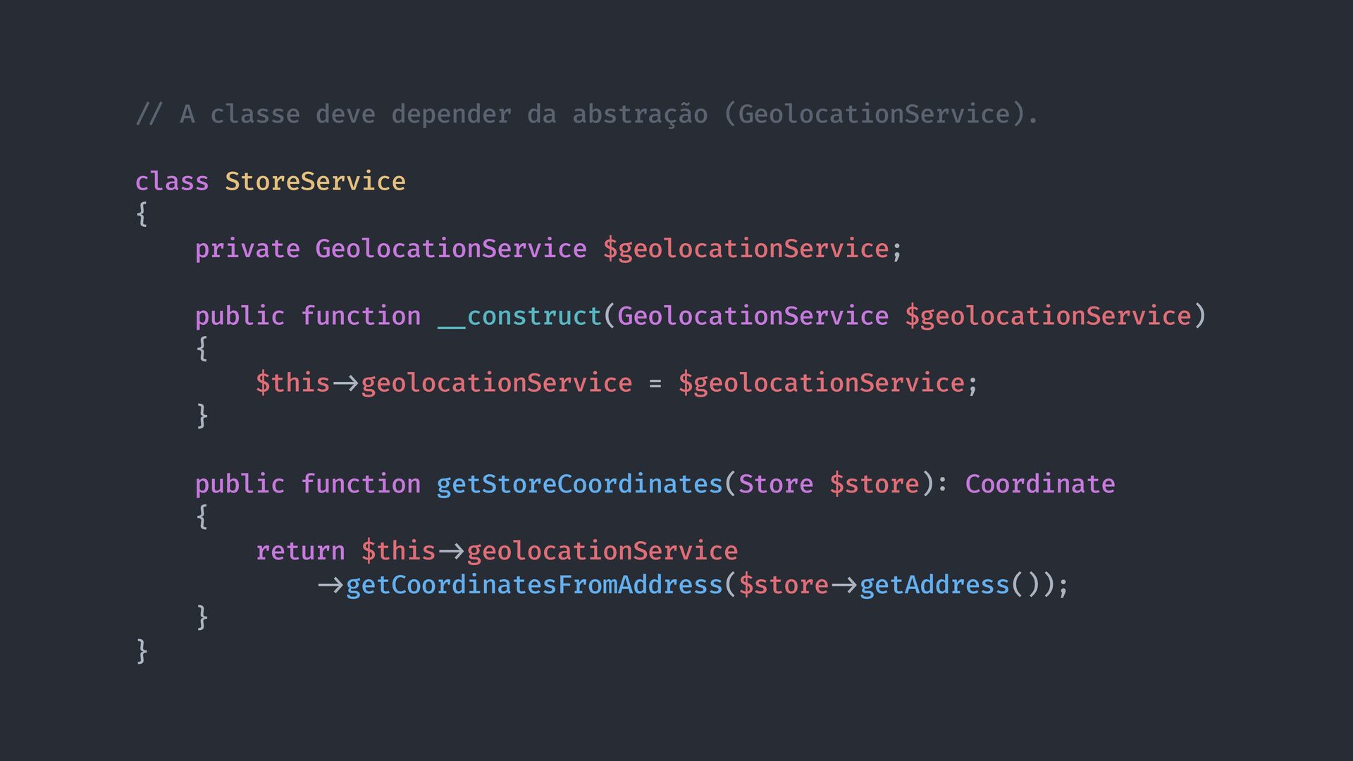 / concreta do serviço de geolocalização do GoogleMaps. class StoreService { public function getStoreCoordinates(Store $store) : Coordinate { $geolocation = new GoogleMaps(); return $geolocation - > getCoordinatesFromAddress($store - > getAddress()); } }
