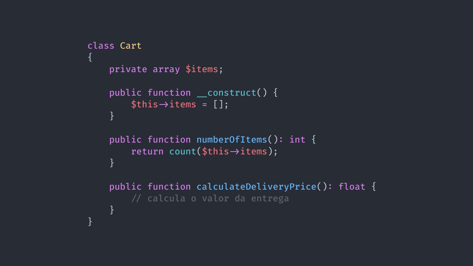 construct() { $this - > items = []; } public function numberOfItems() : int { return count($this - > items); } public function calculateDeliveryPrice() : float { / / calcula o valor da entrega } }