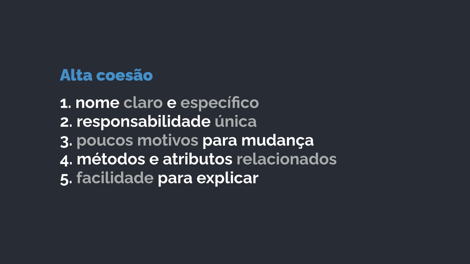responsabilidade única 3. poucos motivos para mudança 4. métodos e atributos relacionados 5. facilidade para explicar