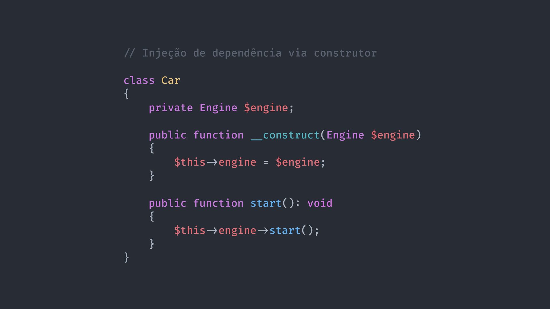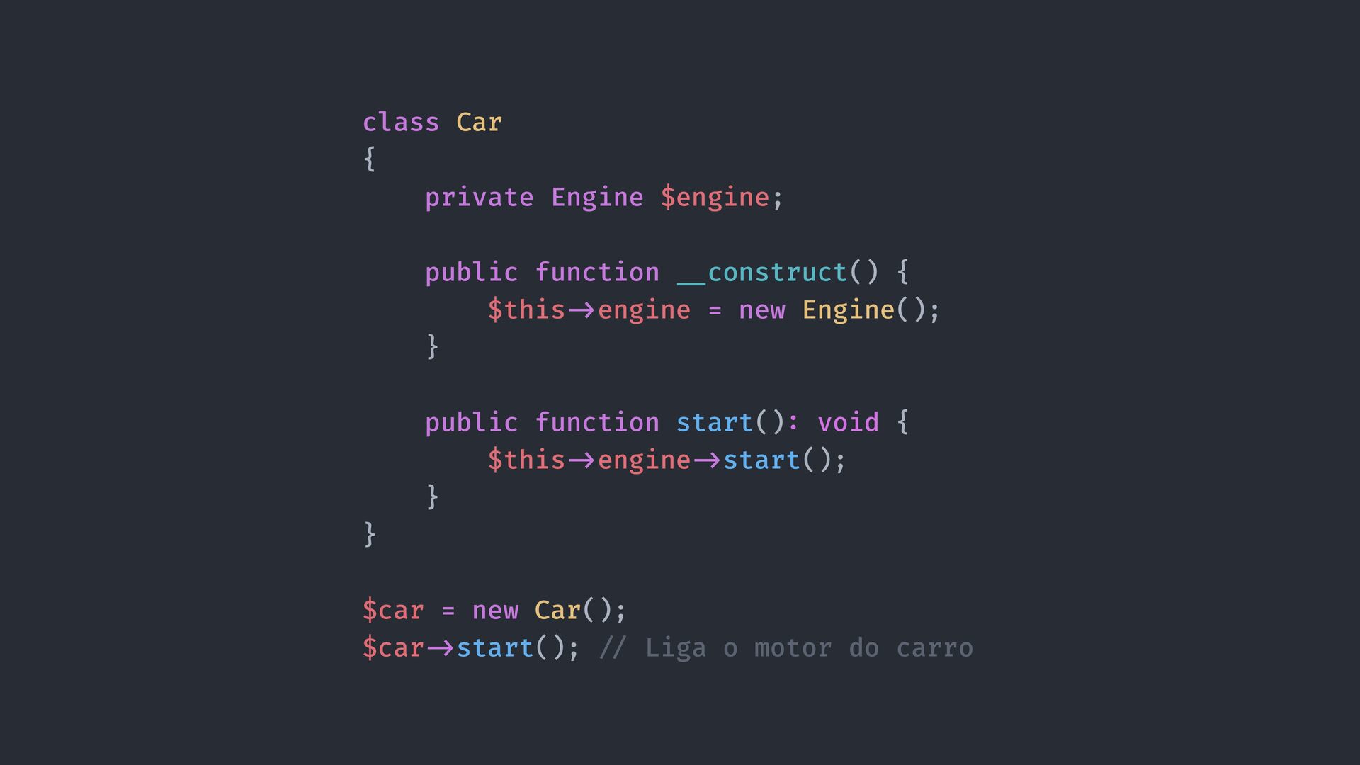 construct() { $this - > engine = new Engine(); } public function start() : void { $this - > engine - > start(); } } $car = new Car(); $car - > start(); / / Liga o motor do carro