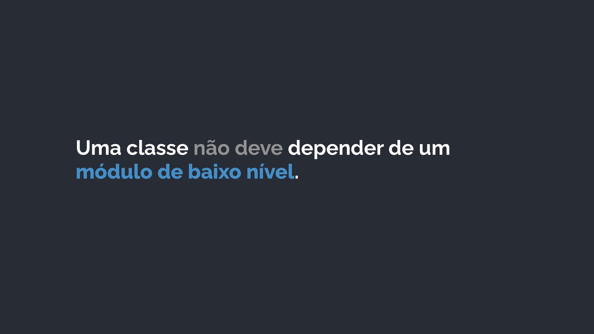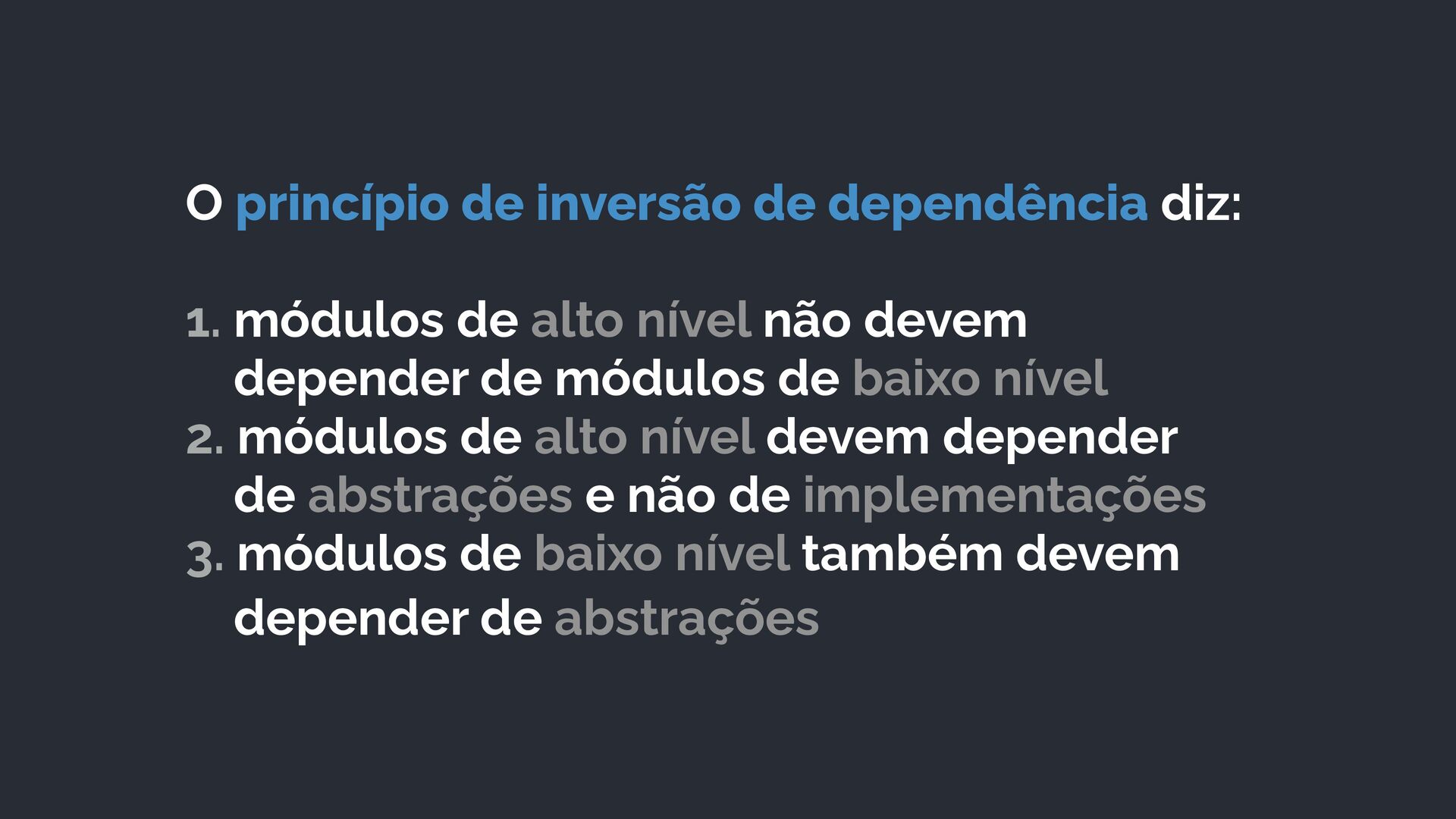 alto nível não devem depender de módulos de baixo nível 2. módulos de alto nível devem depender de abstrações e não de implementações 3. módulos de baixo nível também devem depender de abstrações