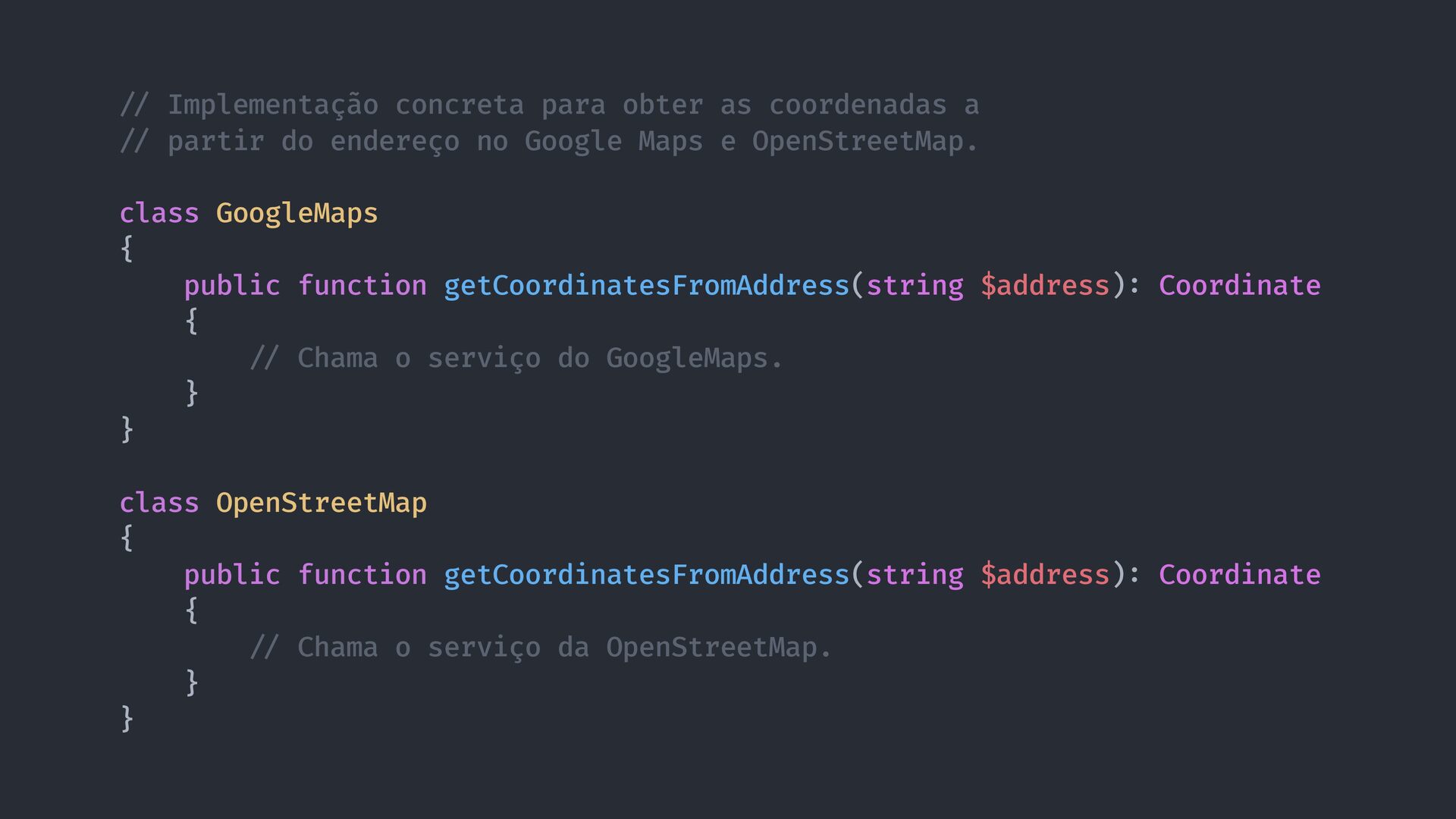/ partir do endereço no Google Maps e OpenStreetMap. class GoogleMaps { public function getCoordinatesFromAddress(string $address) : Coordinate { / / Chama o serviço do GoogleMaps. } } class OpenStreetMap { public function getCoordinatesFromAddress(string $address) : Coordinate { / / Chama o serviço da OpenStreetMap. } }