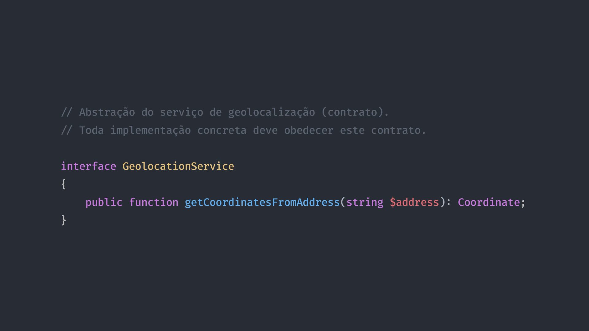Toda implementação concreta deve obedecer este contrato. interface GeolocationService { public function getCoordinatesFromAddress(string $address) : Coordinate; }