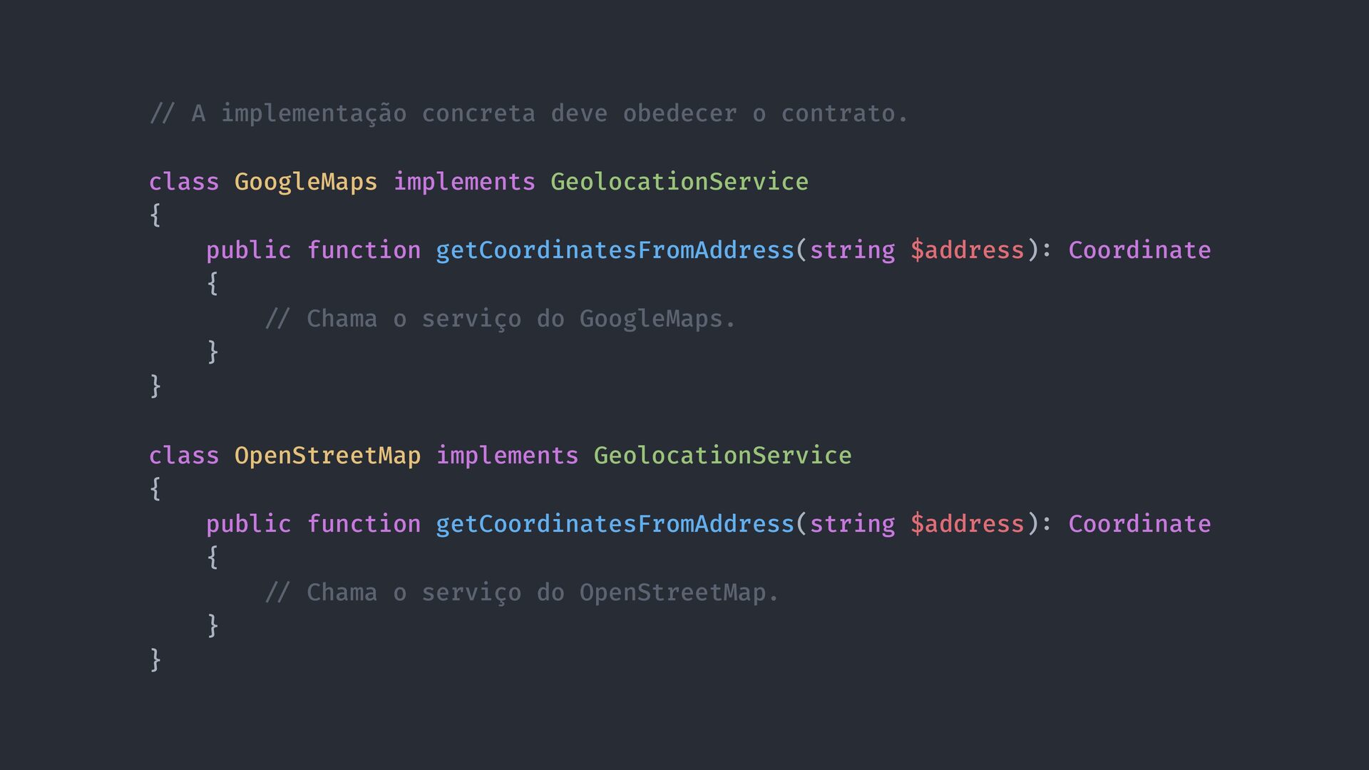 GoogleMaps implements GeolocationService { public function getCoordinatesFromAddress(string $address) : Coordinate { / / Chama o serviço do GoogleMaps. } } class OpenStreetMap implements GeolocationService { public function getCoordinatesFromAddress(string $address) : Coordinate { / / Chama o serviço do OpenStreetMap. } }