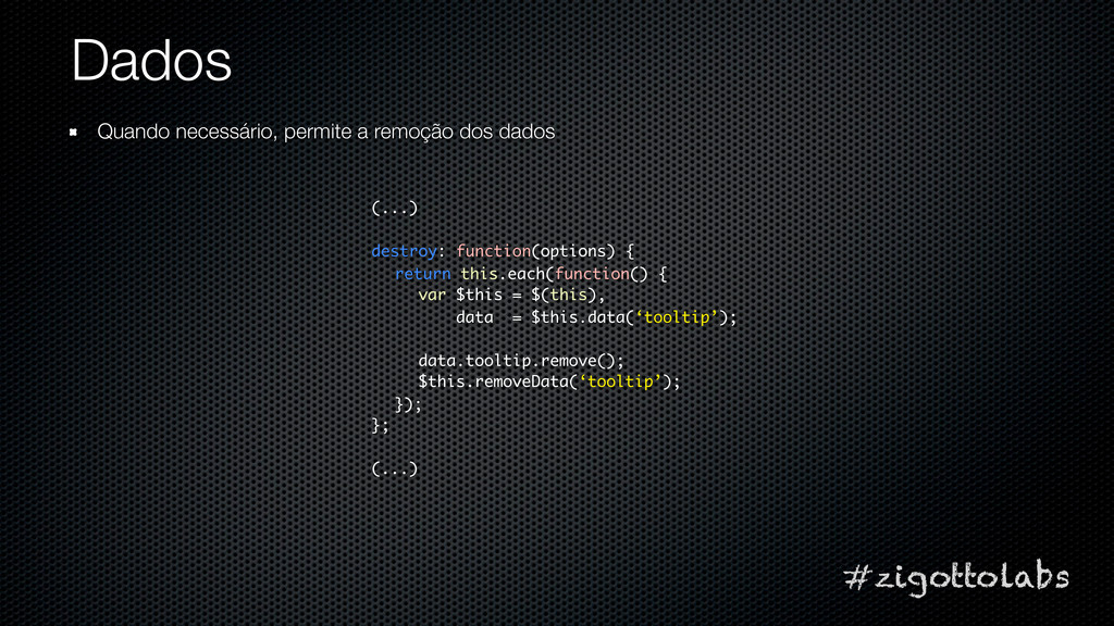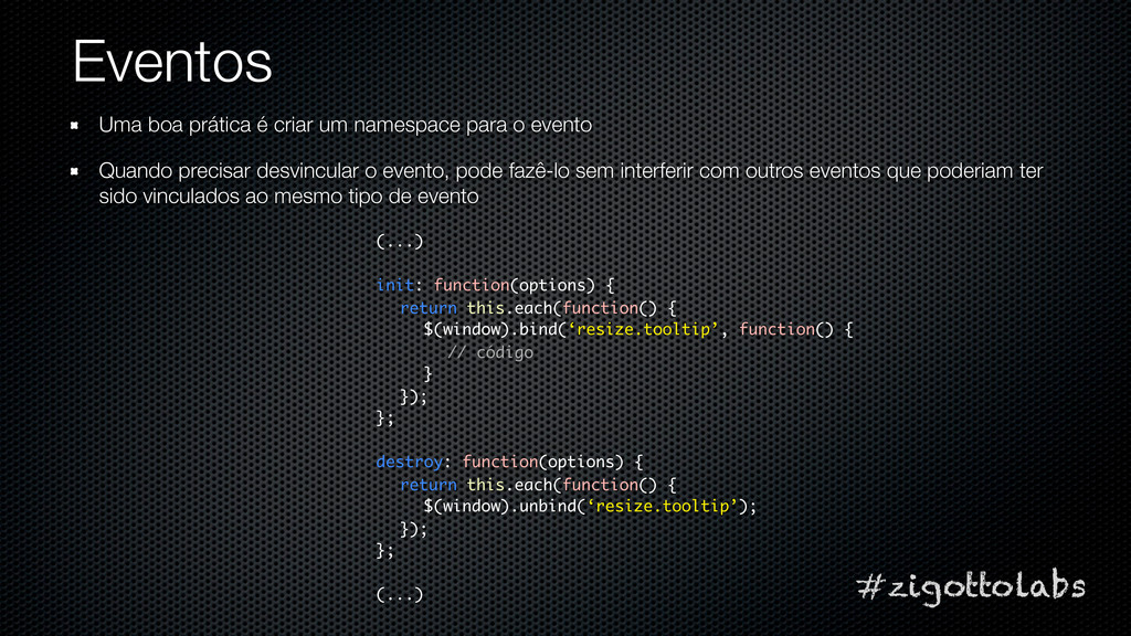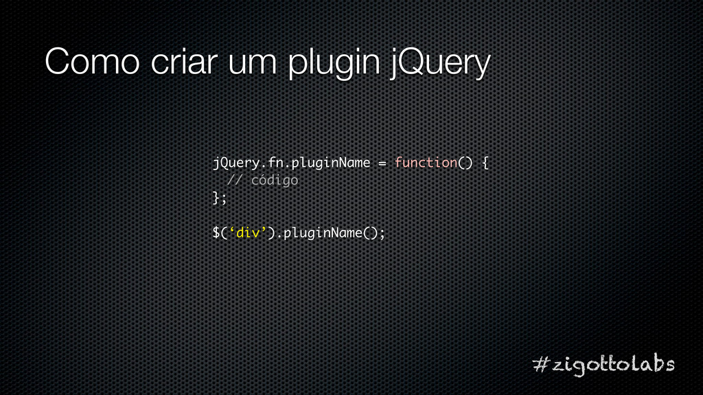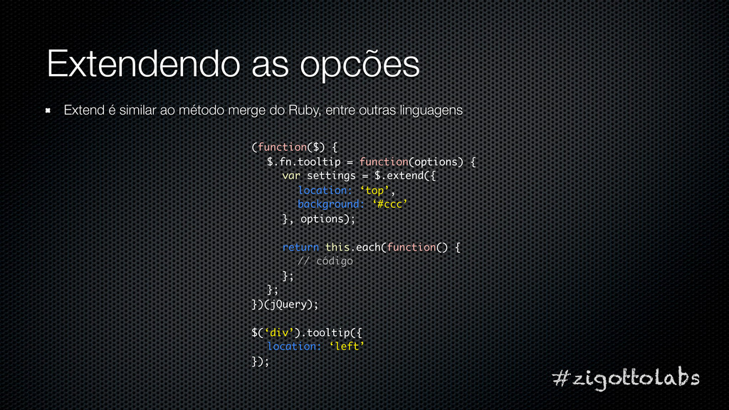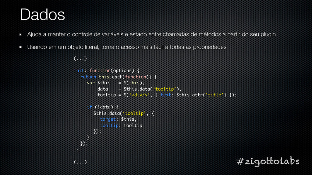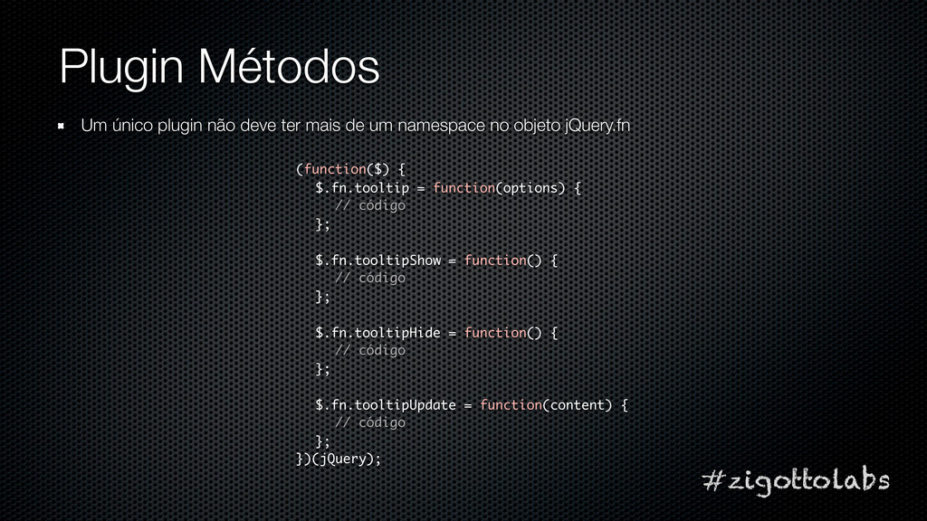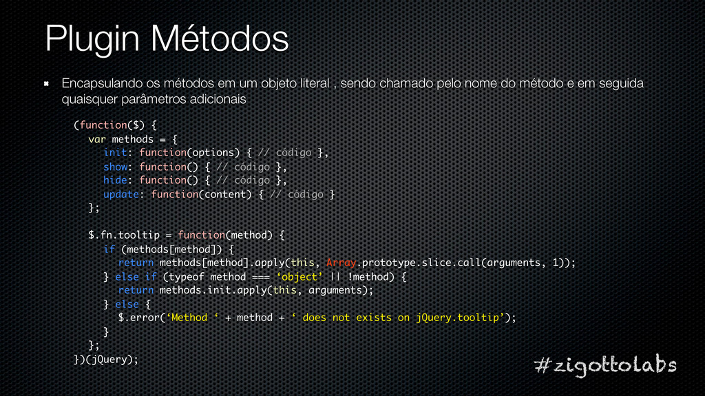 sendo chamado pelo nome do método e em seguida quaisquer parâmetros adicionais (function($) { var methods = { init: function(options) { // código }, show: function() { // código }, hide: function() { // código }, update: function(content) { // código } }; $.fn.tooltip = function(method) { if (methods[method]) { return methods[method].apply(this, Array.prototype.slice.call(arguments, 1)); } else if (typeof method === ‘object’ || !method) { return methods.init.apply(this, arguments); } else { $.error(‘Method ‘ + method + ‘ does not exists on jQuery.tooltip’); } }; })(jQuery); #zigottolabs