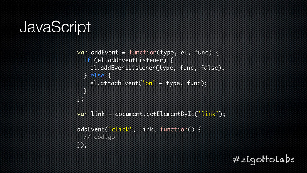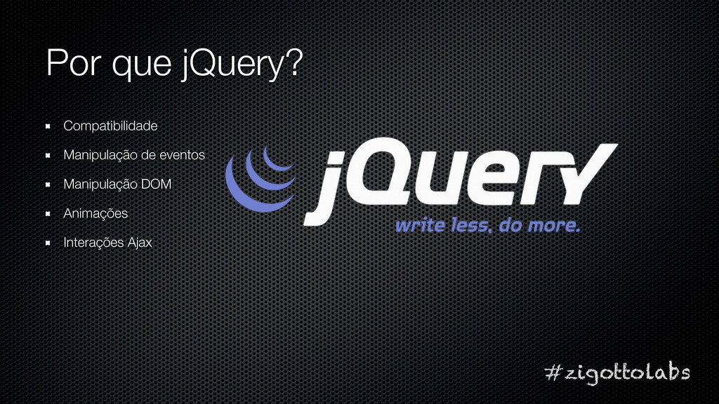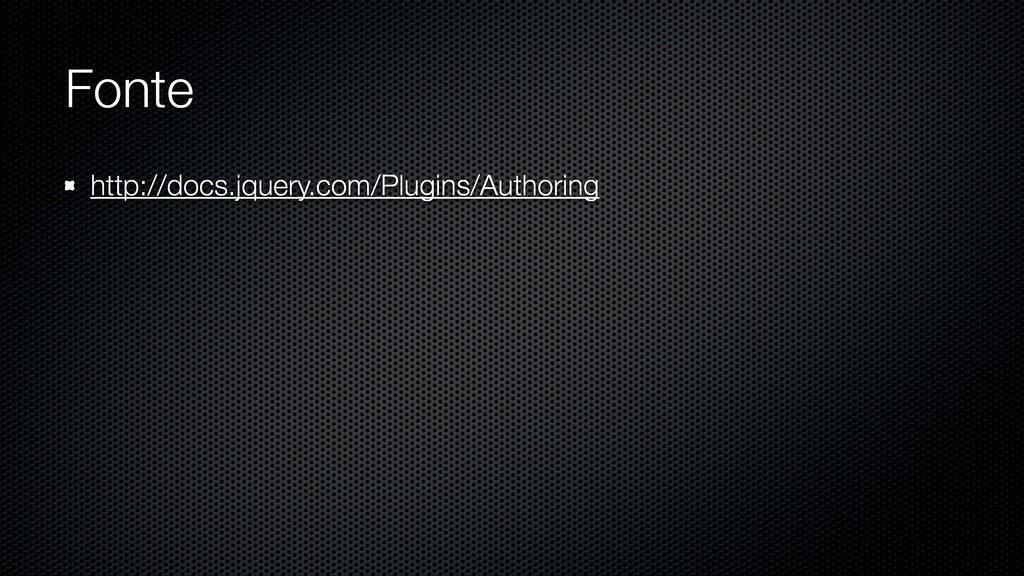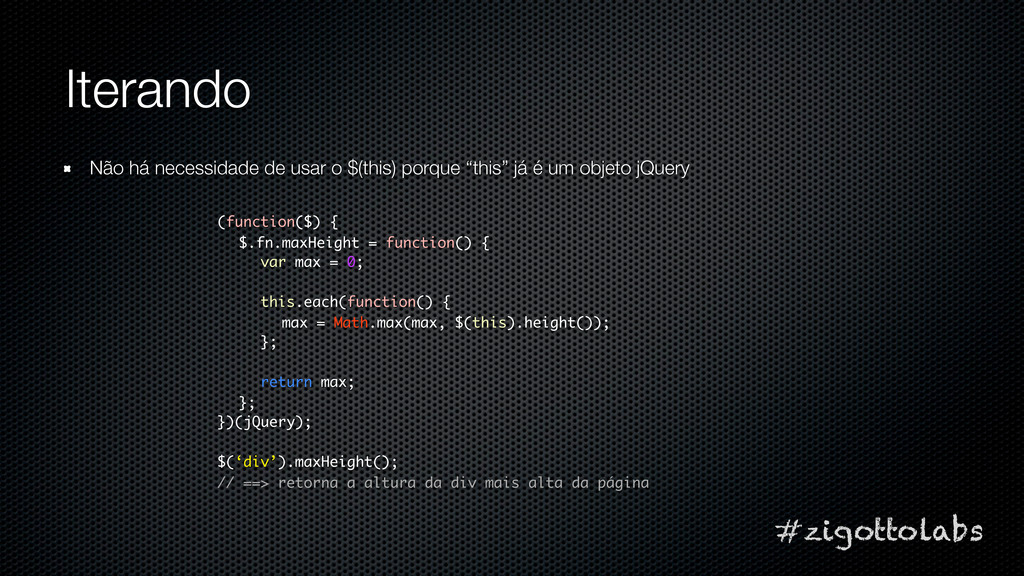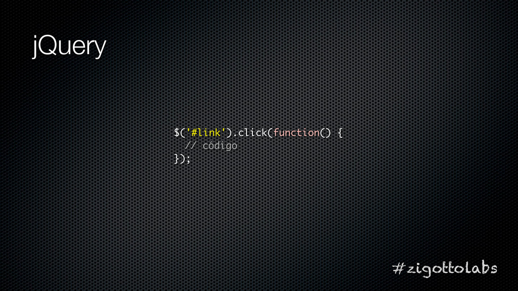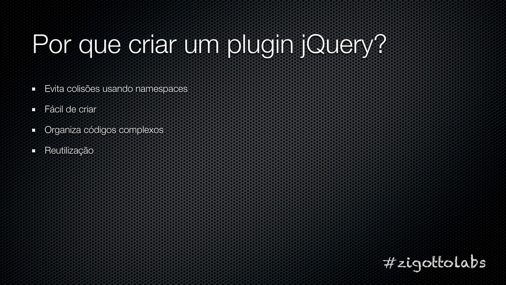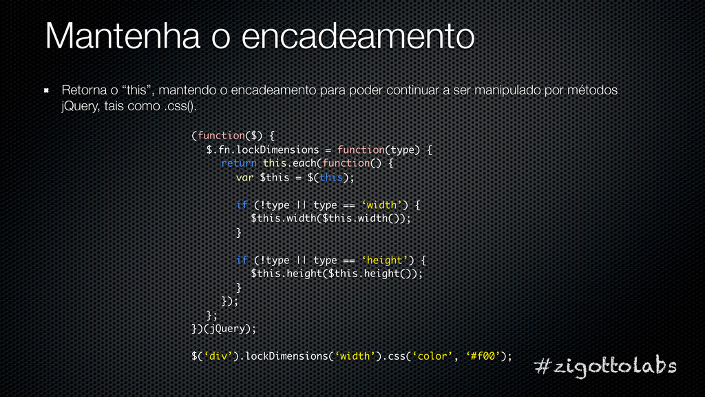 sendo chamado pelo nome do método e em seguida quaisquer parâmetros adicionais (function($) { var methods = { init: function(options) { // código }, show: function() { // código }, hide: function() { // código }, update: function(content) { // código } }; $.fn.tooltip = function(method) { if (methods[method]) { return methods[method].apply(this, Array.prototype.slice.call(arguments, 1)); } else if (typeof method === ‘object’ || !method) { return methods.init.apply(this, arguments); } else { $.error(‘Method ‘ + method + ‘ does not exists on jQuery.tooltip’); } }; })(jQuery); #zigottolabs