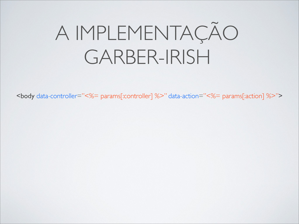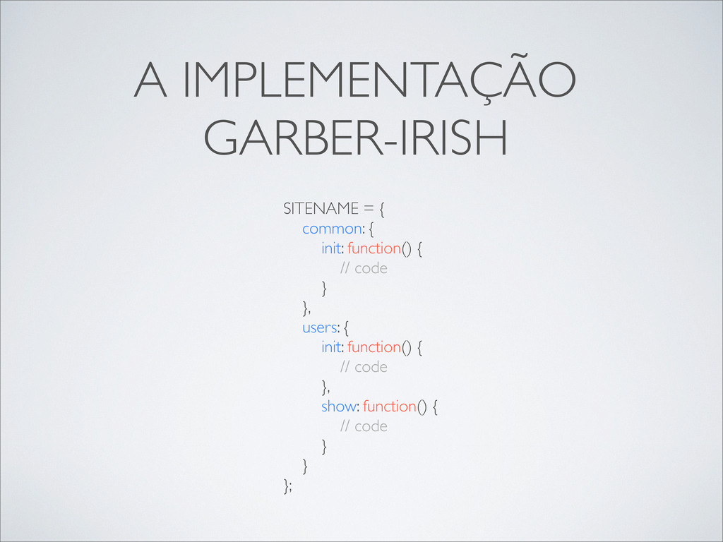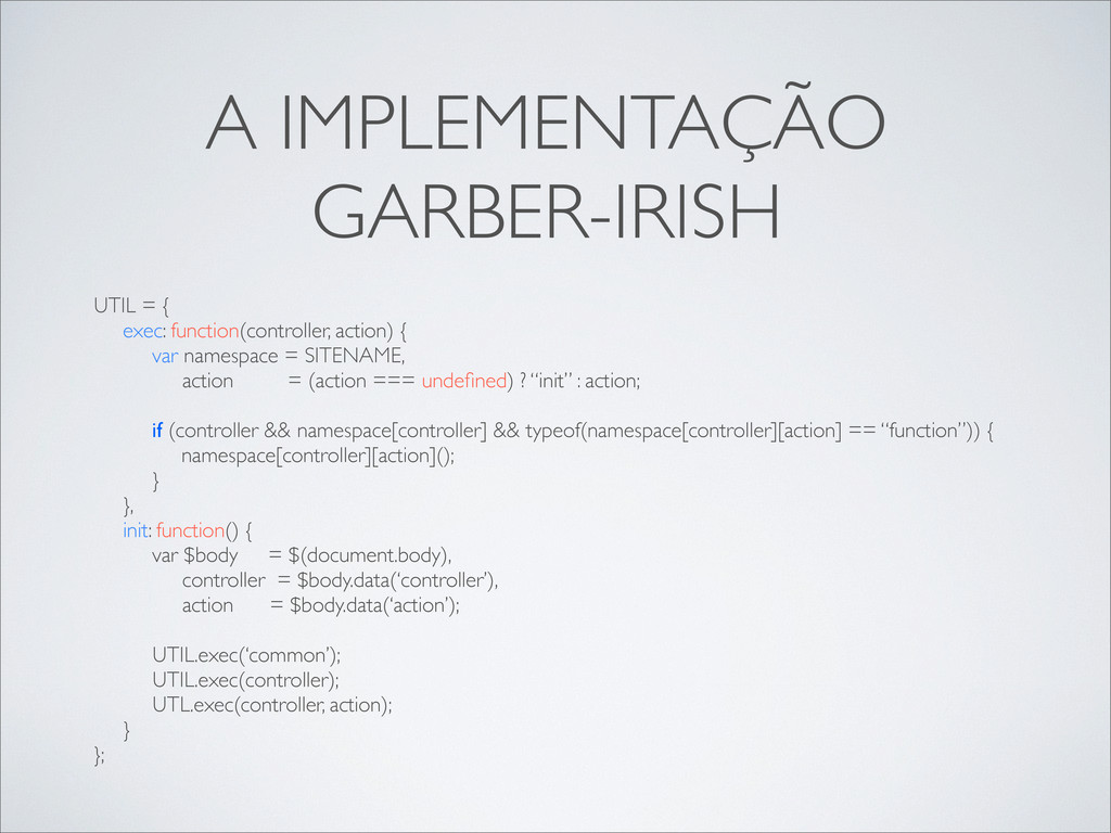var namespace = SITENAME, action = (action === undefined) ? “init” : action; if (controller && namespace[controller] && typeof(namespace[controller][action] == “function”)) { namespace[controller][action](); } }, init: function() { var $body = $(document.body), controller = $body.data(‘controller’), action = $body.data(‘action’); UTIL.exec(‘common’); UTIL.exec(controller); UTL.exec(controller, action); } };