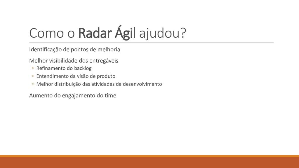 Melhor visibilidade dos entregáveis ◦ Refinamento do backlog ◦ Entendimento da visão de produto ◦ Melhor distribuição das atividades de desenvolvimento Aumento do engajamento do time