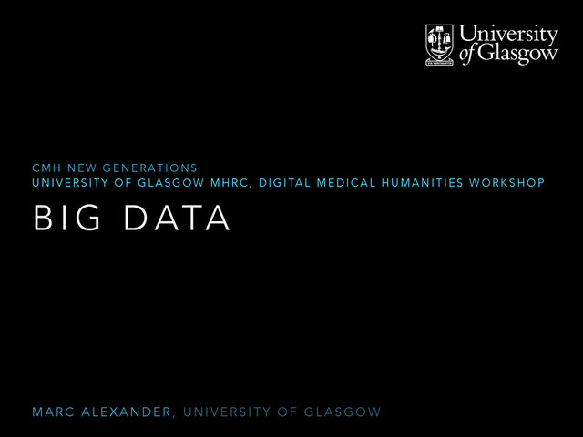 which require rethinking how we process information for research • “In research terms, big data comprises information resources which are so large that they exceed the capacity of commonly used software and other tools, so that users have perforce to develop new approaches and methodologies to analyse them.” (AHRC) • Identified with the sciences – but the problem is at heart a humanistic one • And scale and rethinking information has long been the rationale behind the digital humanities