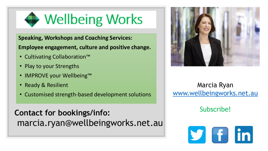change. • Cultivating Collaboration™ • Play to your Strengths • IMPROVE your Wellbeing™ • Ready & Resilient • Customised strength-based development solutions Contact for bookings/info: [email protected] Marcia Ryan www.wellbeingworks.net.au Subscribe!