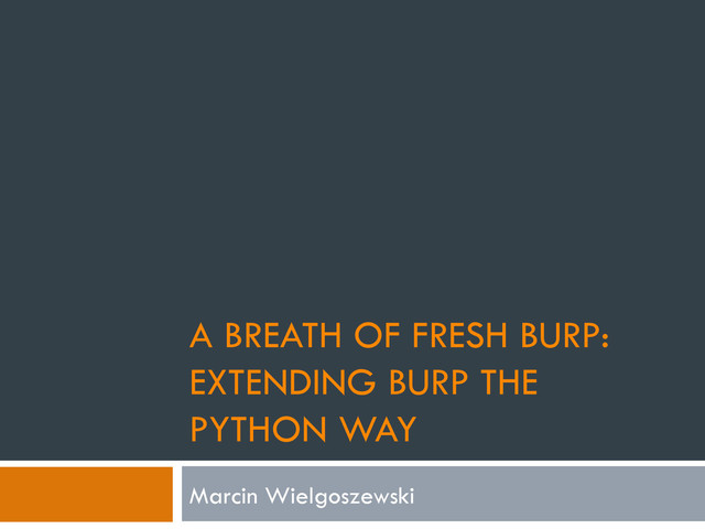 write Burp plugins ¤ Pythonic interface to HTTP request objects ¨ Process requests/responses in filterchain like fashion ¤ On a tool-by-tool basis ¨ Watchdog like monitoring for code reloading ¤ No more having to reload JVM each time ¨ Cuts out a lot of the boilerplate ¤ Less code we have to write