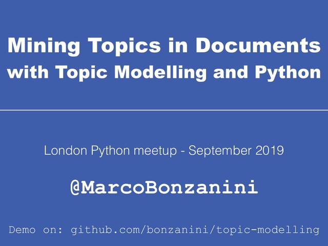 Introduction to topic modelling in Python - presentation given at the London Python meetup in September 2019 (https://www.meetup.com/LondonPython/events/264921863/)