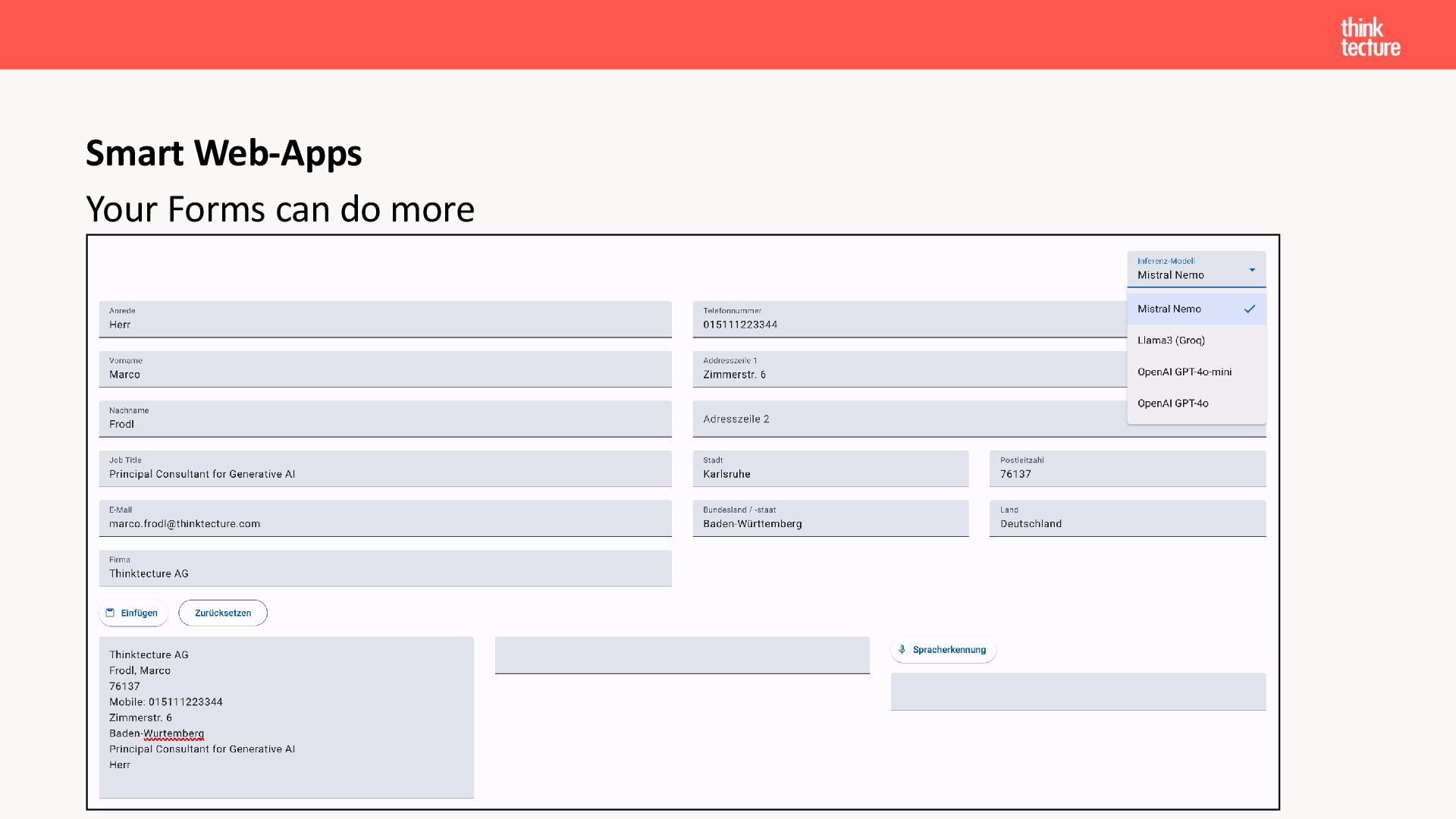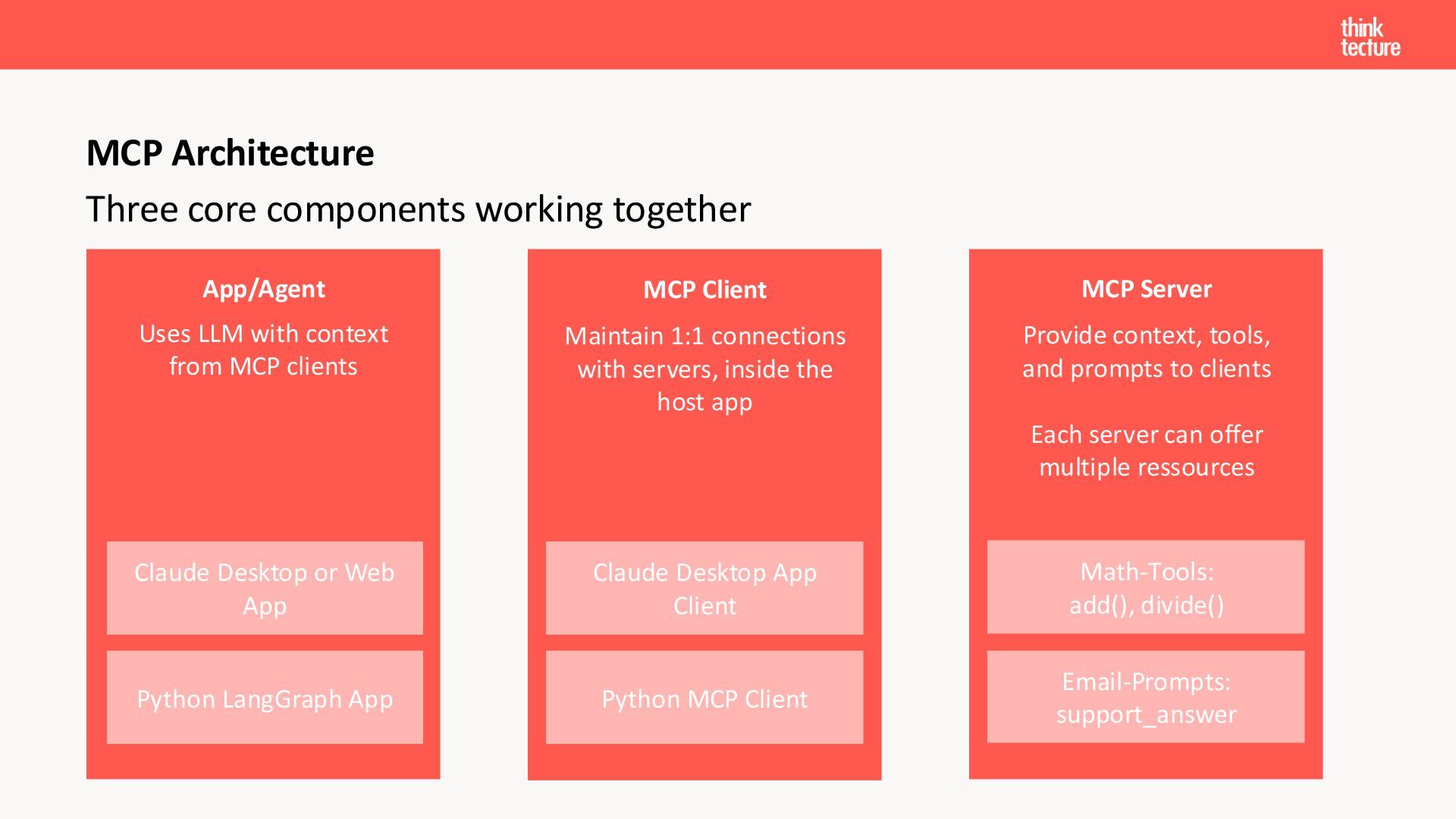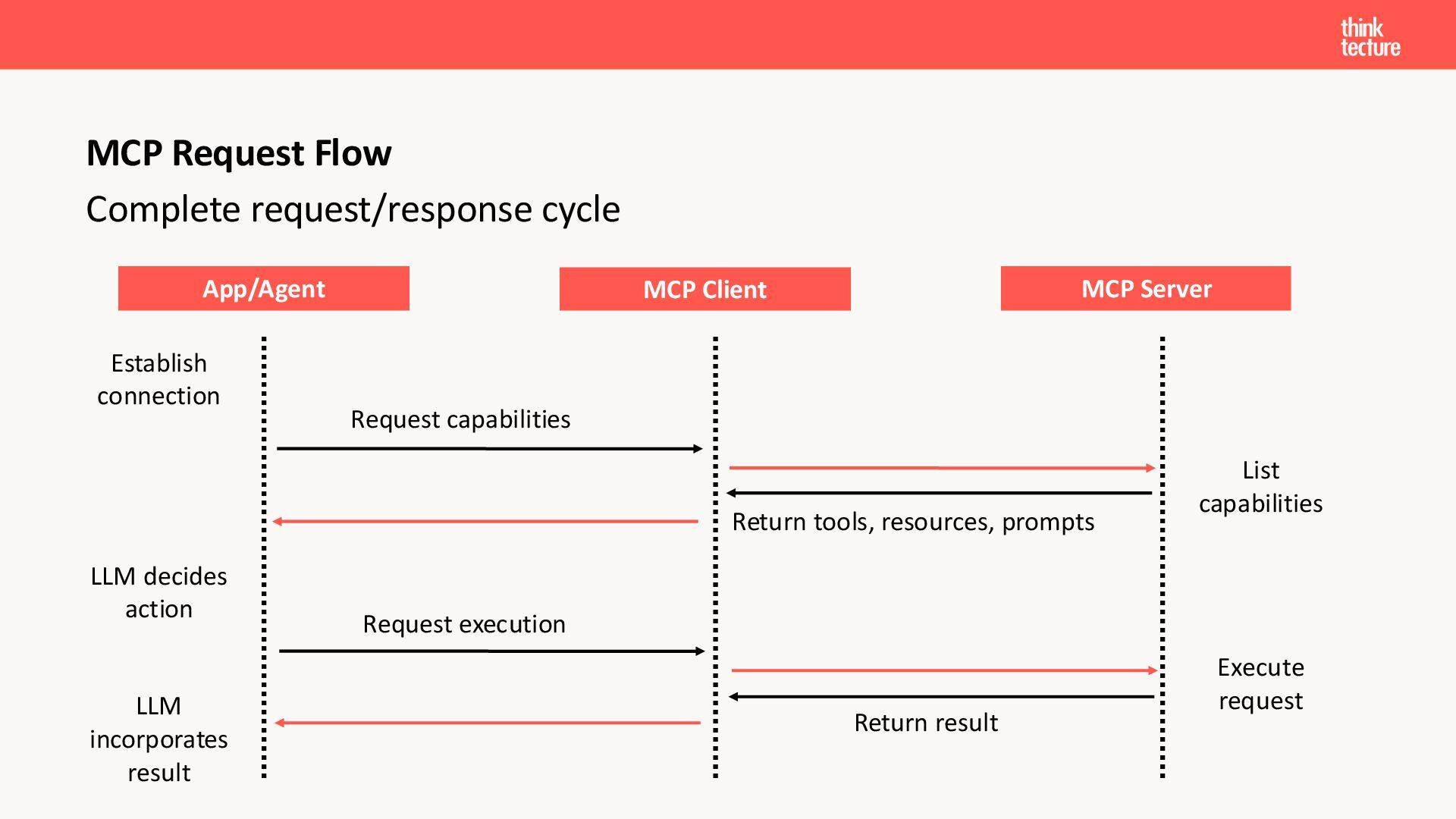 Der Fokus liegt auf modernen Frontend-Herausforderungen: optimaler API-Konsum, Streaming-Implementation für Echtzeit-Antworten, Darstellung von Reasoning-Prozessen bei Thinking-Modellen und die Erweiterung von Anwendungen um TypeScript-basierte MCP Server, die dem AI-Backend Zugriff auf Unternehmensdaten ermöglichen.