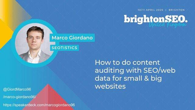 work ✅ How to structure a great content audit ✅ Understand the business model first ✅ Big websites follow different processes Marco Giordano - Data/Web Analyst #BrightonSEO