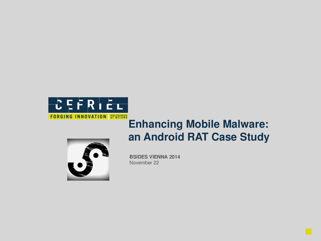 In this context, the goal of this talk is to demonstrate how it is possible to easily create powerful malware, combining public available attack toolkits and exploits of known vulnerabilities. In particular, we focused on mobile devices as the latest trends show how these kinds of terminals are becoming more often target of attacks. Remote Access Toolkits (RATs) for mobile devices are widespread and they could be considered an enabler for attacks aimed to obtain the control of the device itself. Moreover, given the source code of a RAT, it is possible to extend its features, adapting or modifying its behavior to the attacker's needs; for example “hiding” malicious features inside another application, or adding exploits in order to escalate privileges thus obtaining access to the administrative device’s features.