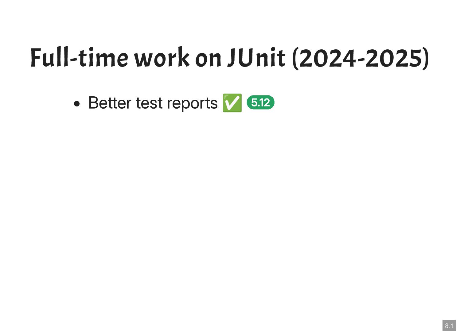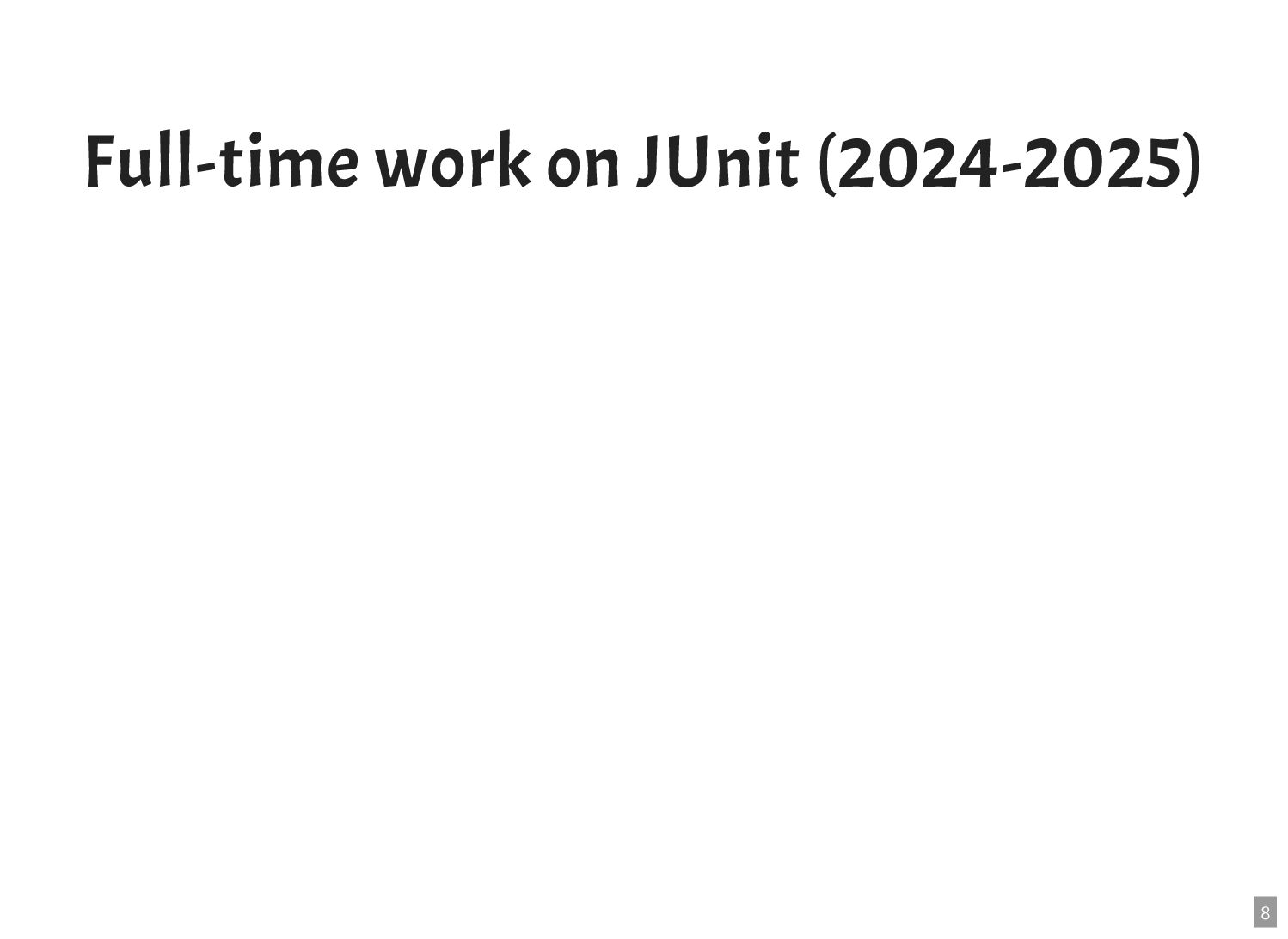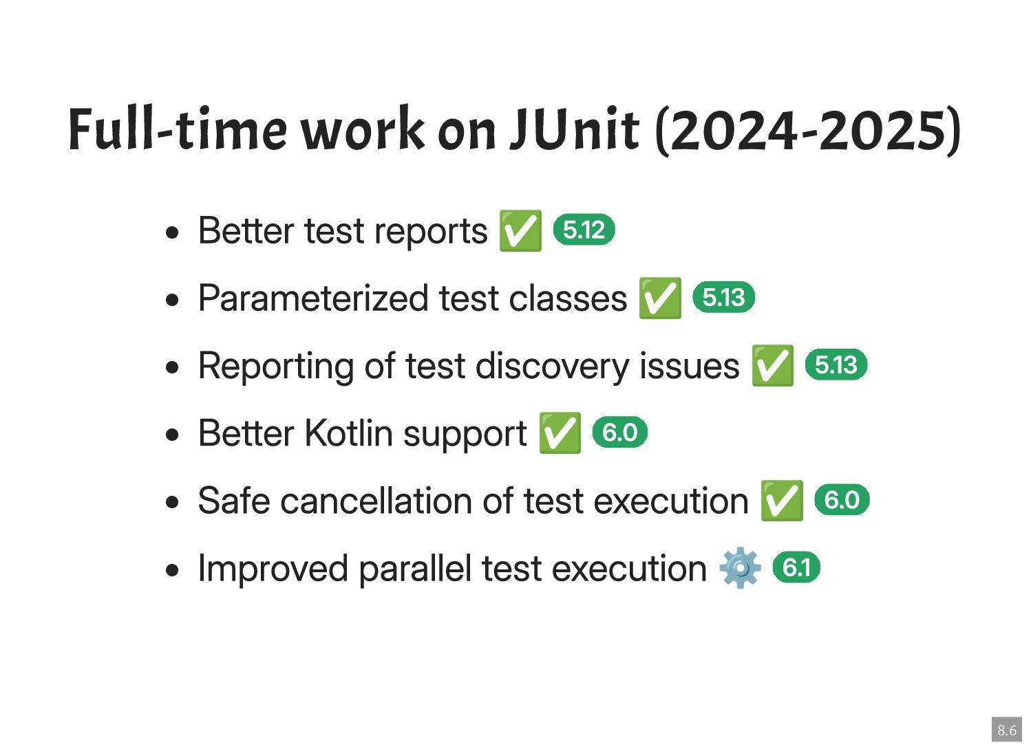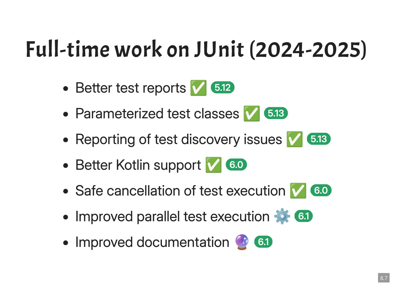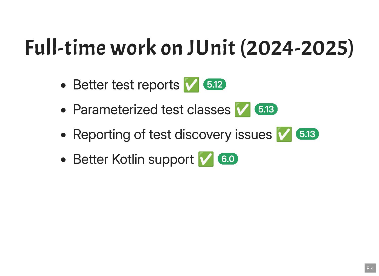 Thanks to the Sovereign Tech Fund I had the opportunity to work full-time on JUnit in 2025 and 2026. In this lightning talk, I will talk about my experience and will shortly introduce new features and improvements. Among them are Open Test Reporting, parameterized test classes, and discovery issues.